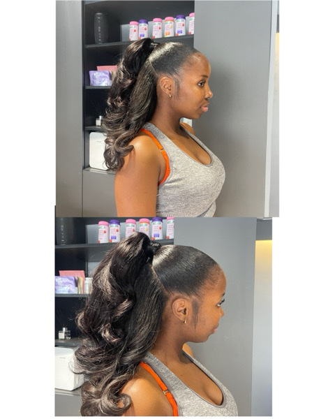This style includes a sleek,styled ponytail using either braiding hair or bundles. Options includes high, mid,or low ponytail,with ,curly,or braided finishes. Good for a quick,polished look that can last up to a week or more with proper care.Prices start from ( GHS 200-400) . Final pricing may vary depending on the complexity of the style. Simple styles are fixed at( GHS 200-300) , while more intricate or time-consuming styles may cost more.Free extensions may be used for styles that require small extensions