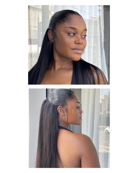 A sleek and stylish ponytail using a lace frontal for a seamless, natural hairline finish. This look blends the frontal perfectly into your scalp for a polished, elegant ponytail that can be worn high, mid, or low. Ideal for both casual and formal occasions — clean, classy, and confident.Prices start from GHS 500. Final pricing may vary depending on the complexity of the style. Simple styles are fixed at GHS 500, while more intricate or time-consuming styles may cost more.